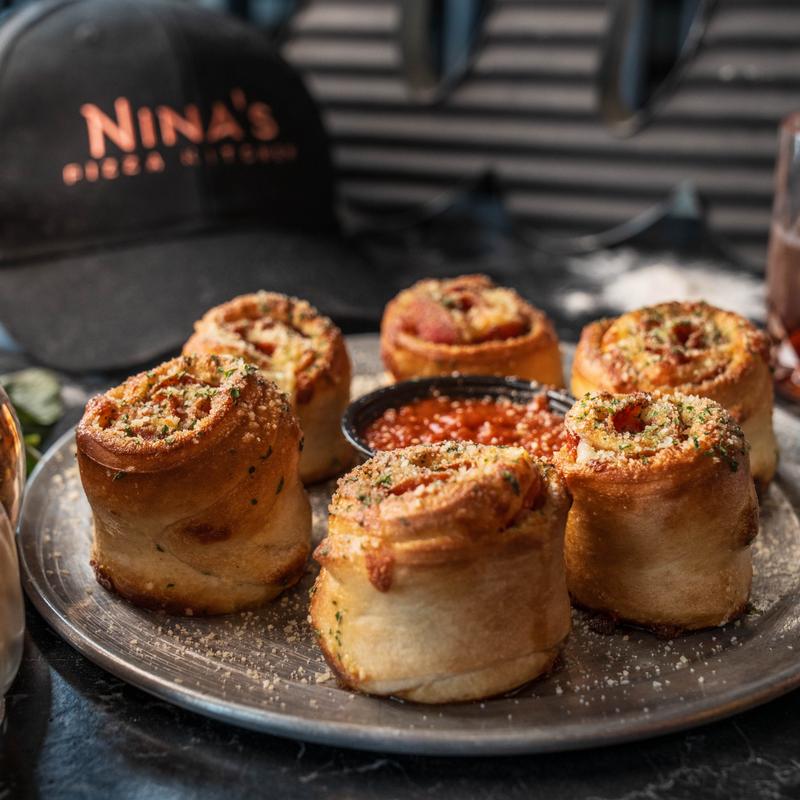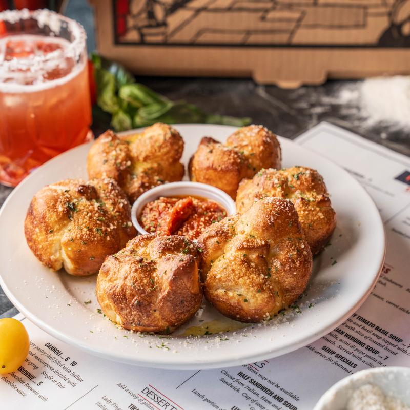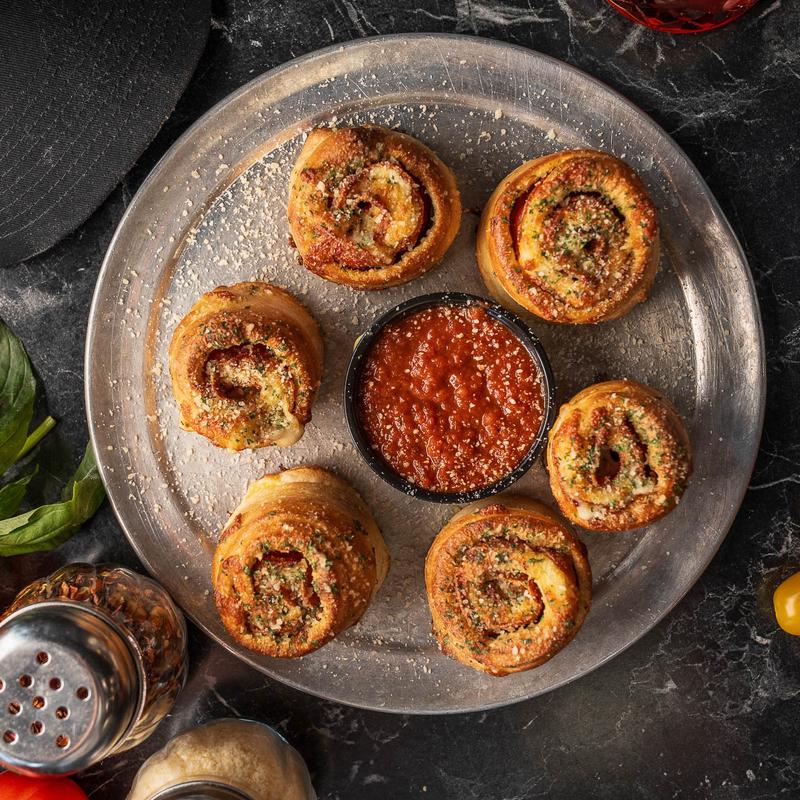 Pizza dough rolled up with pepperoni and mozzarella, topped with parmesan cheese, served with marinara sauce