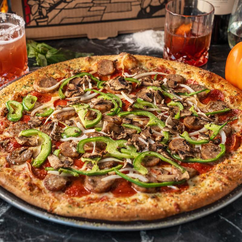 Pepperoni, sausage, onions, peppers, mushrooms