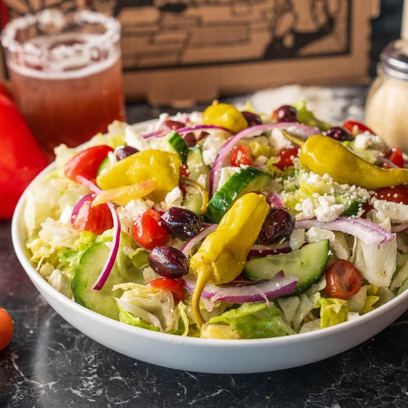 Iceberg with tomatoes, kalamata olives, cucumbers, feta cheese, pepperoncini peppers