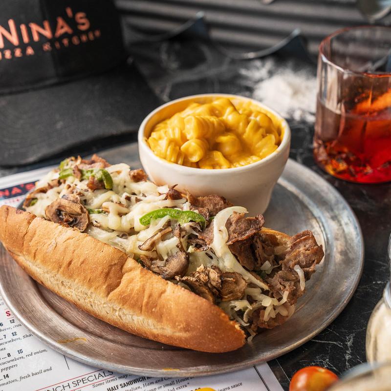 Oil base with shaved Philly meat, onions, peppers, mushrooms, and provolone cheese
