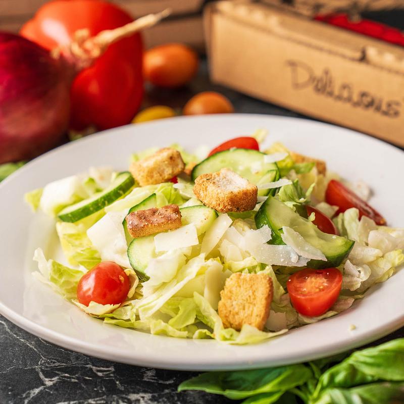 House salad with iceberg, romaine, tomatoes, cucumbers, cheese, croutons