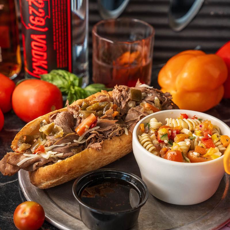 Olive oil base with seasoned Italian roast beef, giardiniera peppers, onions, and provolone cheese