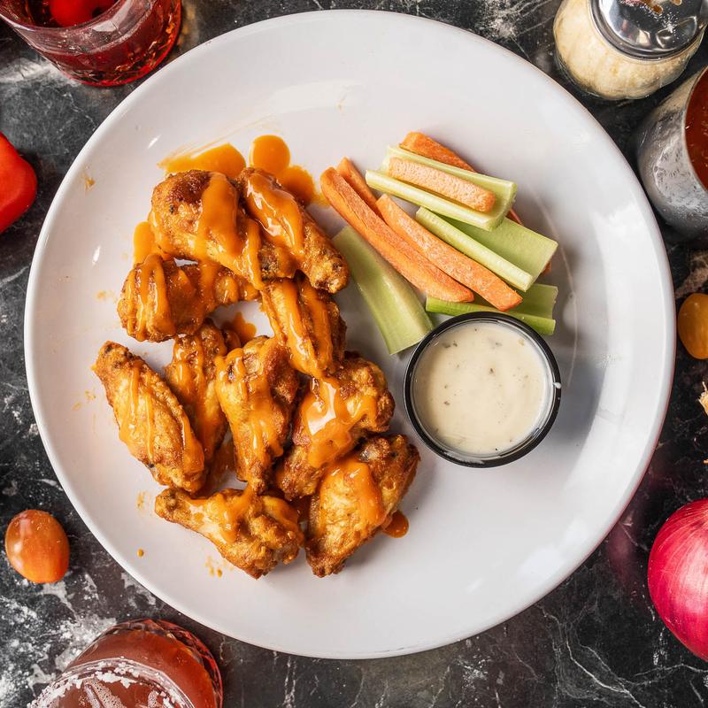 5 Pc Oven Roasted Wings. Served with your choice of sauce or rub, with carrots, celery and dipping sauce