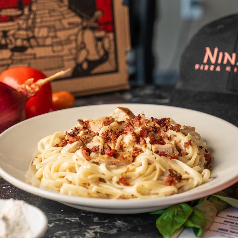 Fettuccine pasta tossed with alfredo sauce topped with chicken, bacon, and shaved parmesan cheese