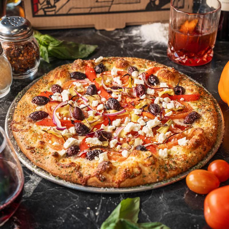Olive oil base with, tomatoes, roasted red peppers, artichokes, red onion, and kalamata olives with feta cheese