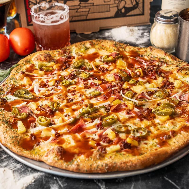 BBQ sauce base, ham, bacon, pineapple, onion jalapeño peppers
