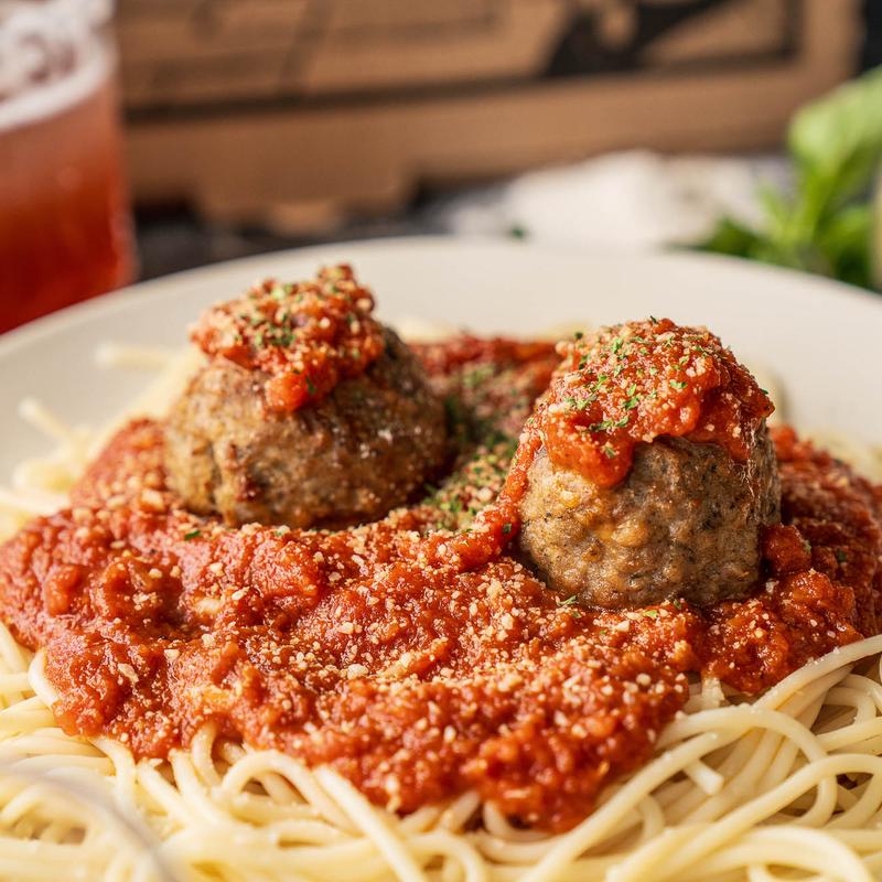 Spaghetti pasta topped with marinara sauce. Served with two meatballs